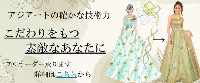 アジアートではお客様のご希望に合わせてステージドレスのお直しやフルオーダーを承っております。サイズオーダードレス、丈直しやウエスト詰め以外のお直しにつきましても、お気軽にご相談ください。