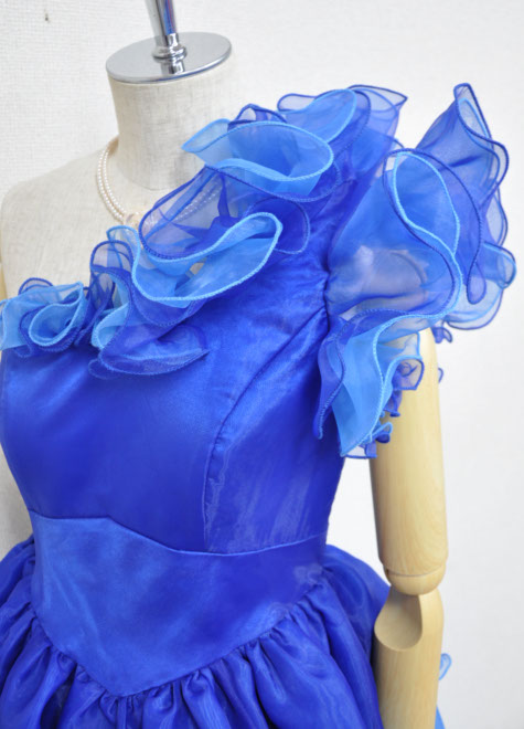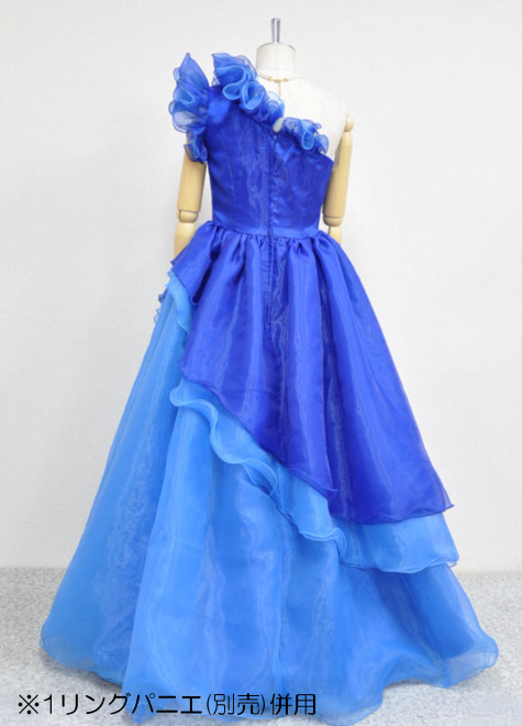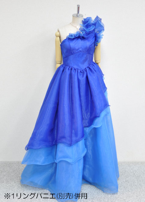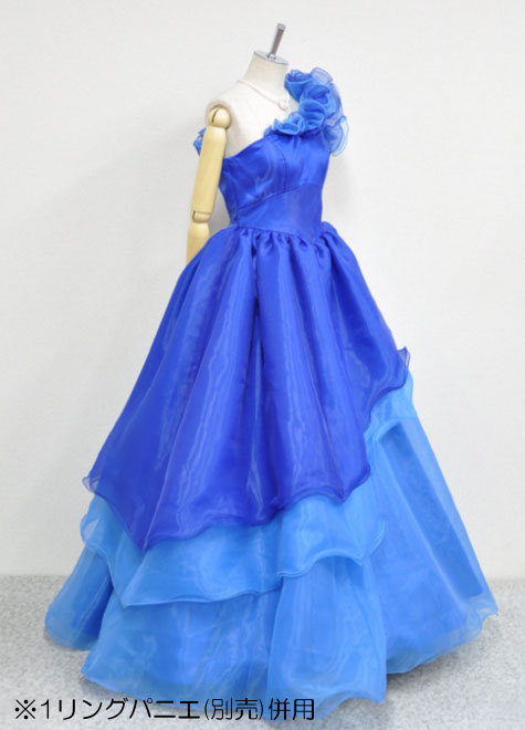 オーガンジーをたっぷり使ったフワフワが素敵?ドレスの内側にチュールを縫い付けた構造のため、ドレス単体でもふんわりしますが、更に1リングパニエ併用で主役ドレスとしてお使いいただけるボリュームに?お色は夏の海のような鮮やかなブルー。とっても綺麗なお色です。