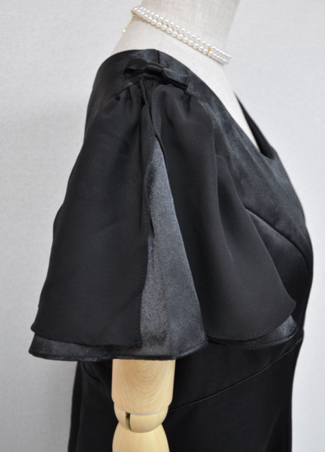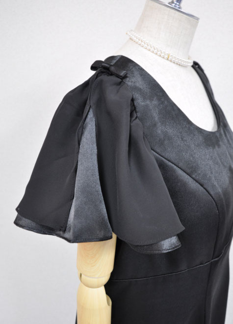 人気のロングセラー商品がメリードレスにも登場。つるん☆とした光沢のサテン派のあなたにはこちらがお勧め。生地の厚みはタフタと同等ですが、タフタよりも柔らかく、しなやかな質感が特徴。お袖部分はサテンにシフォンを重ねた2枚構造で肩先に小さなリボンが乗っかっています。