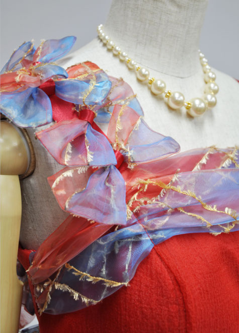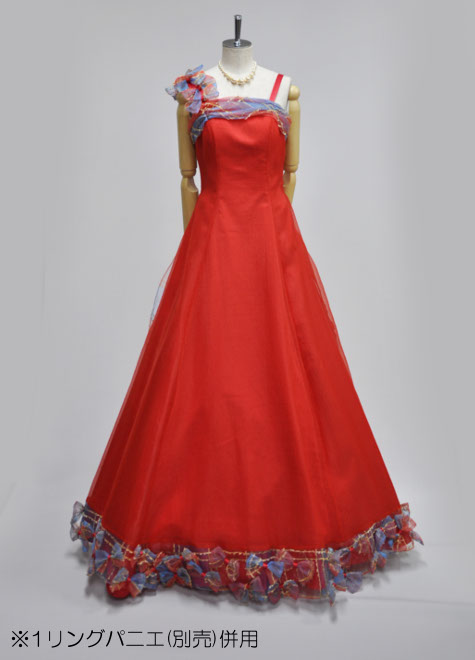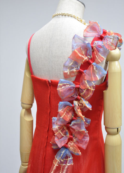 鮮やかなレッドにチェックのリボンがいっぱい付いた若々しいデザイン。メイン素材はシワ加工のあるオーガンジー。発色のいいレッドがひと際目を引きます。パニエ併用で綺麗なAラインのシルエットになり、背面に垂らしたリボンのデザインも活かせますが、ドレス単体での着用もOK。お使いになるシーンに合わせてボリュームを使い分けてくださいね♪