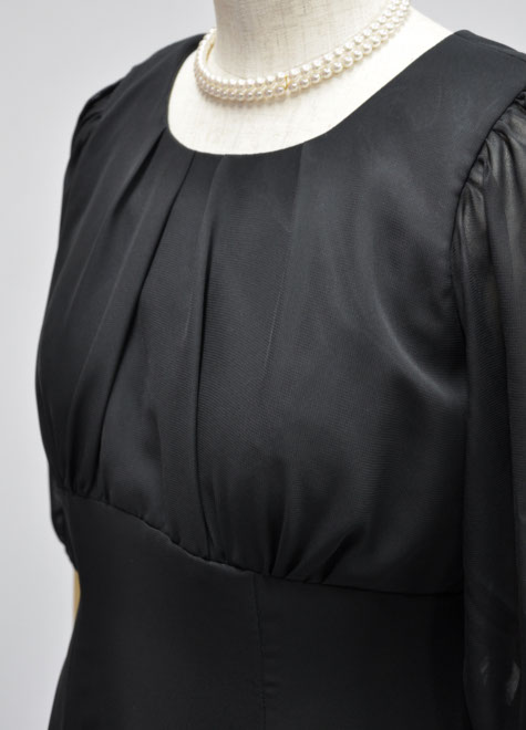 難しいお袖付デザインにセンスある1着が登場♪一歩間違えると老けて見えがちなお袖付スタイルですが、外側に配置したレースやウエストのリボン、長過ぎないフレアースリーブが若々しく、年齢問わず素敵に着ていただけるお勧めデザインです。ちょっと分かりにくいですがレース部分は裏地に淡いピンクを使用しているため、モノトーンの配色よりもなんとなく柔らかさを感じるのも小技が利いてます。お袖はシフォン素材でどんな楽器にも支障なくお使いいただけるよう袖口は広め。胸元とスカート中央部分の黒い素材はバックサテンを使用しております。通常のサテンの光沢のない面を使用することにより、落ち着いた高級感があるのもポイントです♪※お写真は通常丈のドレスです。小柄な女性向けのパターンに修正して登場しております。
