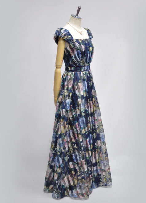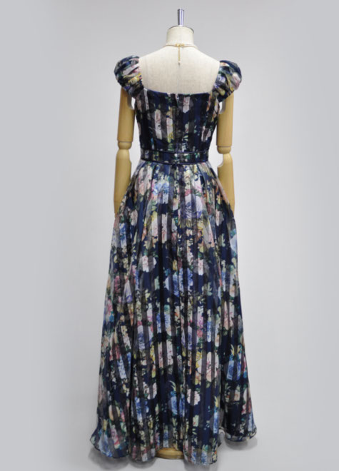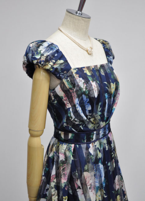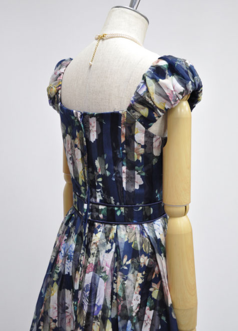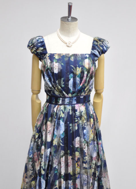 フラワープリントのロマンティックとストライプのすっきり感が出会ったオーガンジードレス♪お写真はドレス単体ですが、1リングパニエとの相性も良いデザインです。生地に限りがあるため、販売期間は他の商品に比べ短めです。お早めにご検討ください。