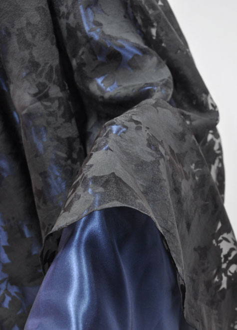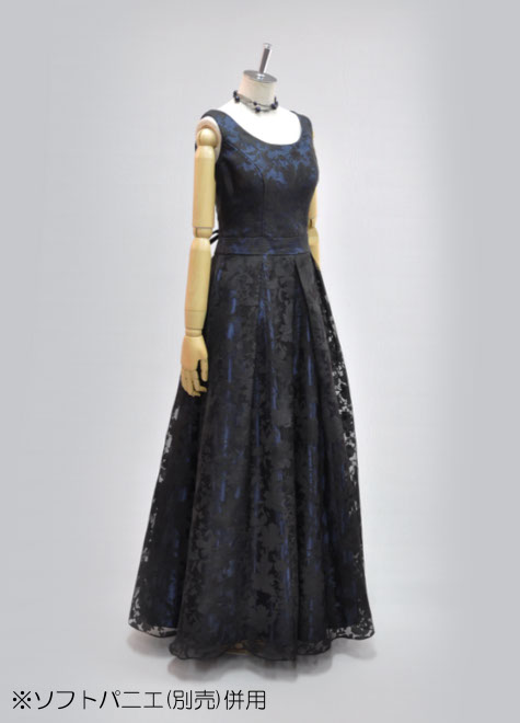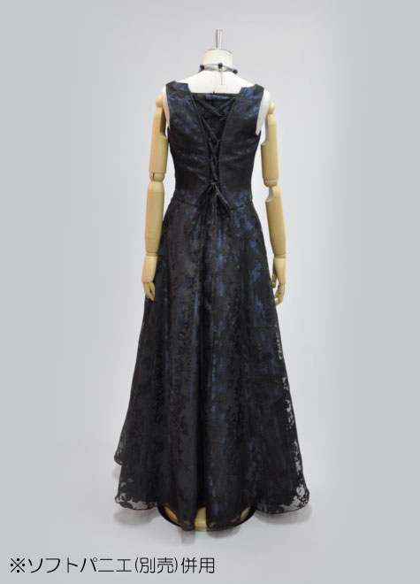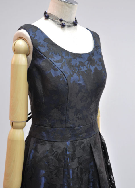 表地は柄部分が透ける黒色素材。裏地に紺色を合わせ、柄が浮き出るような印象。派手さはないですが、とっても上品な印象ですので初めてのステージやサポート出演などの控えめなシーンにおすすめのステージドレスです。背面編み上げの構造もデザインの一部として素敵にマッチしています。
