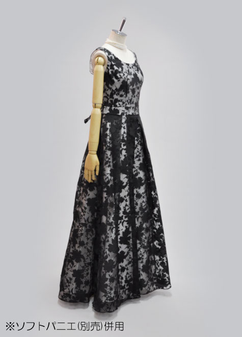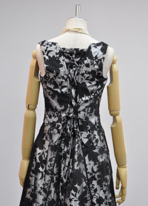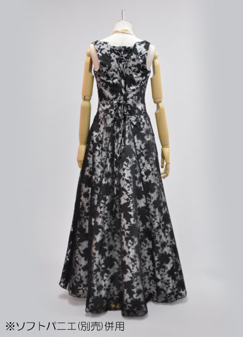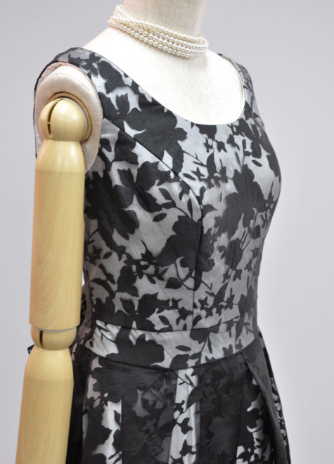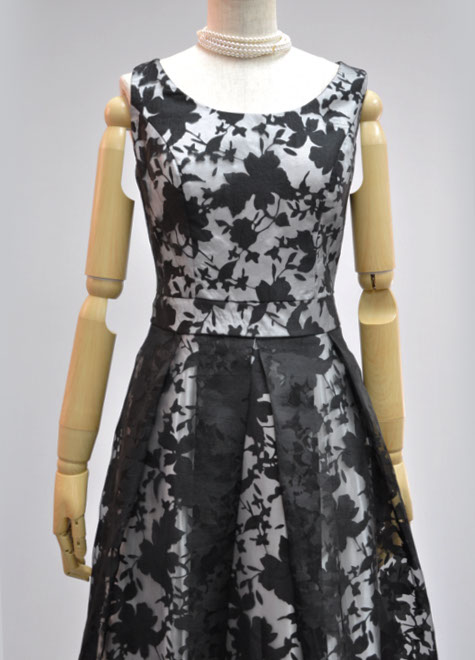 表地は柄部分が透ける黒色素材。裏地に白色を合わせ、柄がしっかり浮き出て涼し気です。派手すぎず地味すぎない印象なので、初めてのステージや伴奏などにおすすめのステージドレスです。背面編み上げの構造もデザインの一部として素敵にマッチしています。ピアノ伴奏用の黒ドレス。