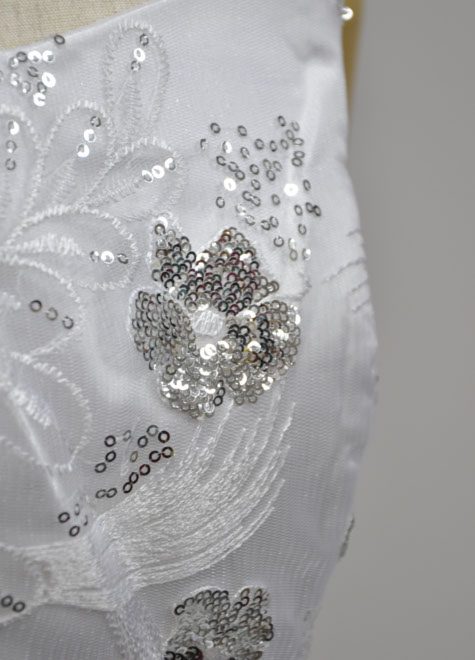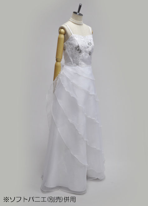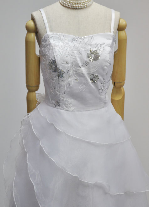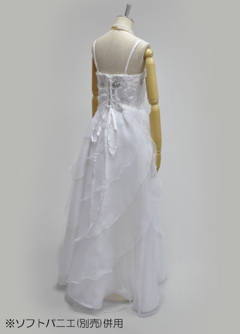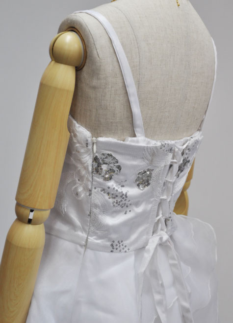 着用時、左ファスナーを上げ、背面のリボンで絞め上げます。サイズの対応範囲が広いですので、体型変化が心配な方にもお勧めなステージドレスです。