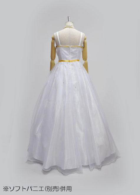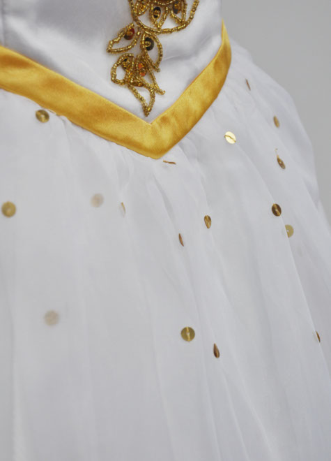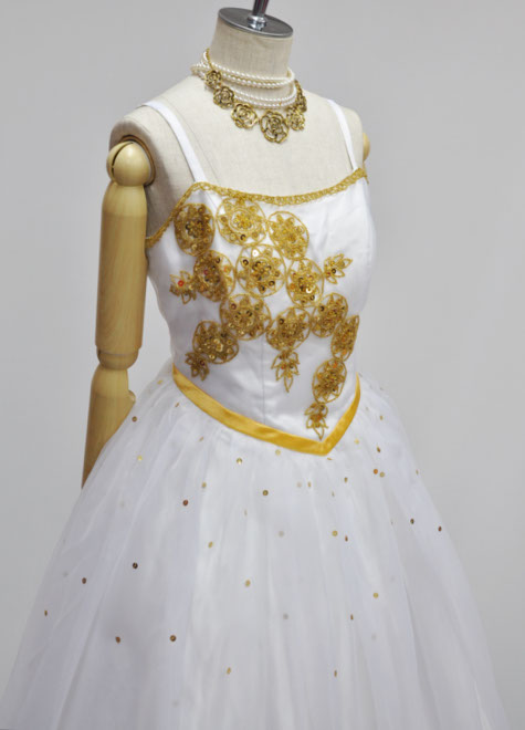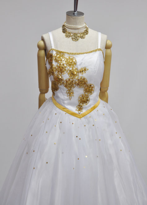 透明感と清潔感のナンバーワンカラーはやはり【ホワイト】。舞台が明るくなるお勧めのカラーですが、ウエディングドレスを代用するのはもう古い・・・です。きちんとステージ用に考えられたホワイトドレスをお選びくださいネ。こちらはレースのようなビーズ刺繍が特徴のオーガンジードレス。ヴァイオリンなどの楽器演奏を想定して肩紐の装飾はあえて付けない事にしました。ウエスト周りにもスパンコールを散らし、ホワイトながら真っ白ではないのがステージ向きです♪こちらの刺繍はゴールド。クリスマスシーズンに合わせDT9のみ再入庫いたしました。その他のサイズはセミオーダーにて承ります。