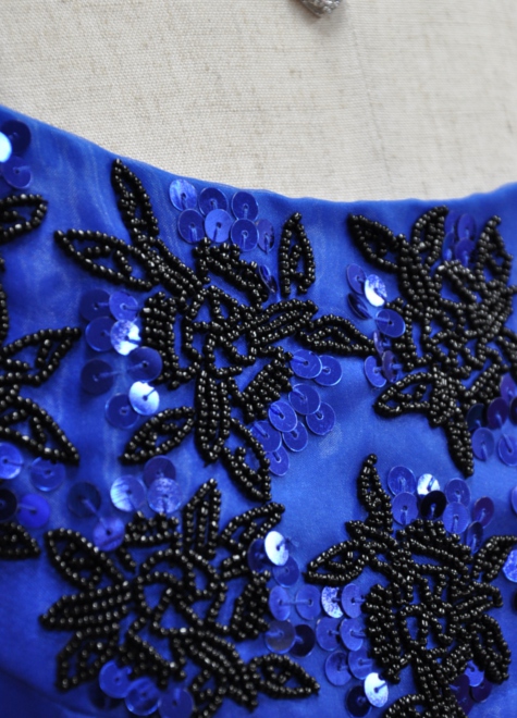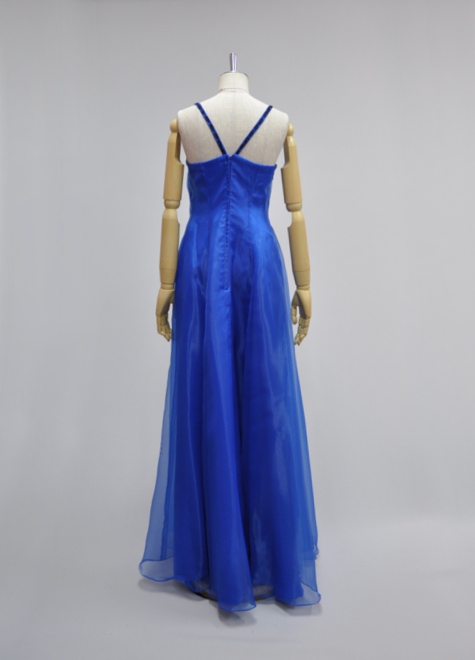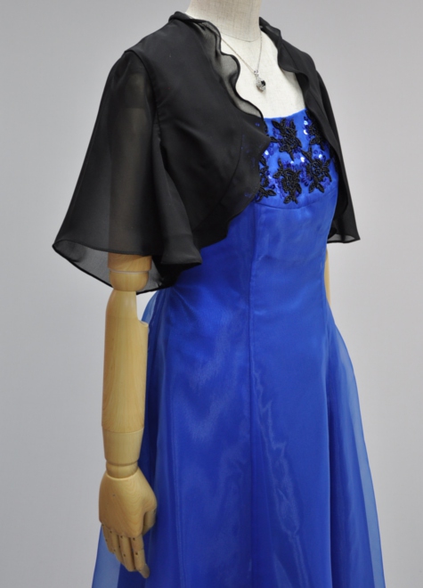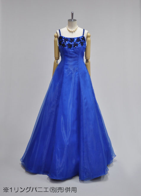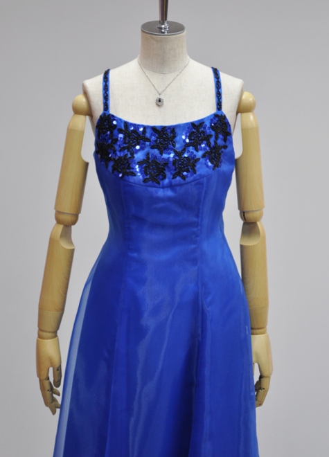 綺麗なブルーに黒ビーズの手刺繍が素敵なデザイン。シンプルなシルエットですので1リングパニエを併用して豪華さを出してもいいですし、ブラックのボレロを合わせて控えめな雰囲気でも素敵です。こちらの現品は身長+ヒールの合計寸が約170cmの方向けの【TT丈】。合計寸が約165cmの方はパニエ併用でちょうどいい丈になります。それ以外のドレス丈をご希望の方はセミオーダーがお勧め。