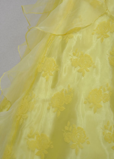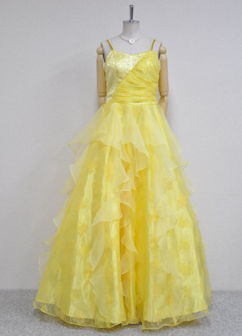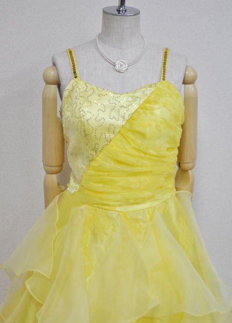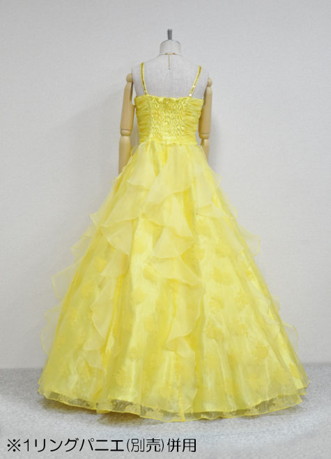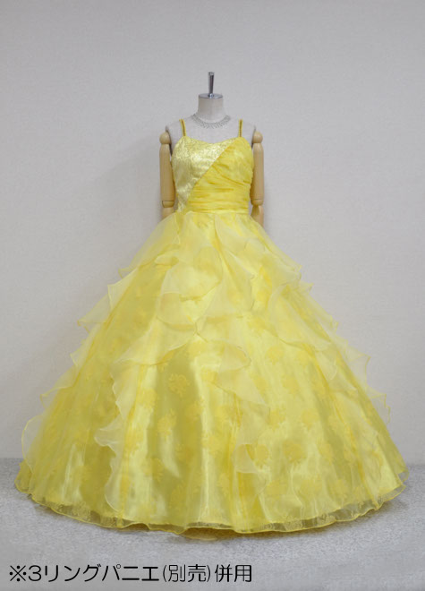 パニエは1リング~3リングまでお好みによって併用できる万能ボリューム。勿論パニエ無しでドレス単体で着用していただいても適度なフンワリ感のある豪華なドレスです。背面がギャザー仕様ですので、伸縮性があるのも魅力。楽器演奏で動きやすさを重視する方、声楽でブレス時の窮屈感を避けたい方に好評の構造。地模様のあるプリントオーガーンジーをメイン素材にし、胸元にはゴールドのスパンコールが点々と輝きます。さらにお色もいい!!イエローは舞台をぱぁっと明るくしてくれる元気カラーですので、華やかな出番には大変お勧めですよ。