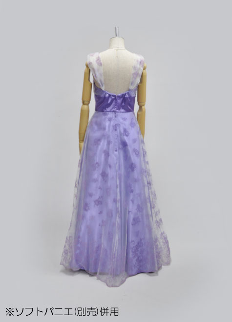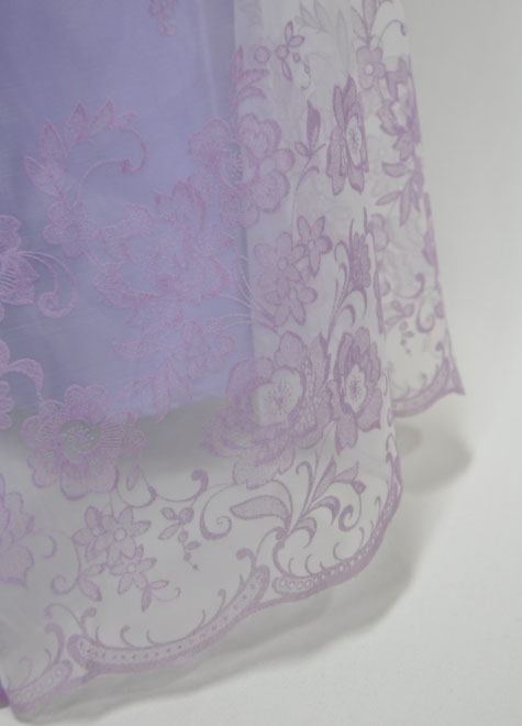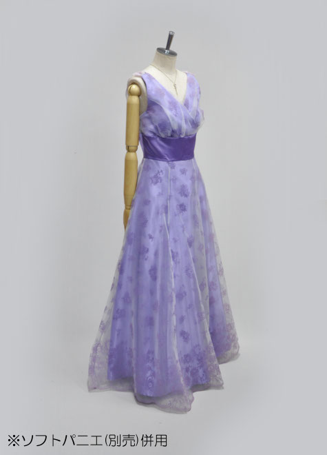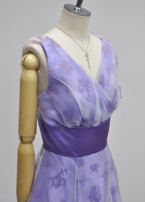 立体的なフロッキープリントが素敵なオーガンジードレス。ノースリーブスタイルの前面に太めのストラップスタイルの背面を組み合わせた中間的なデザイン。背中の開きはやや深めですがお色が控えめなので華やかさとしては丁度良いでしょう。ウエスト部分の濃いパープルはサテンです。