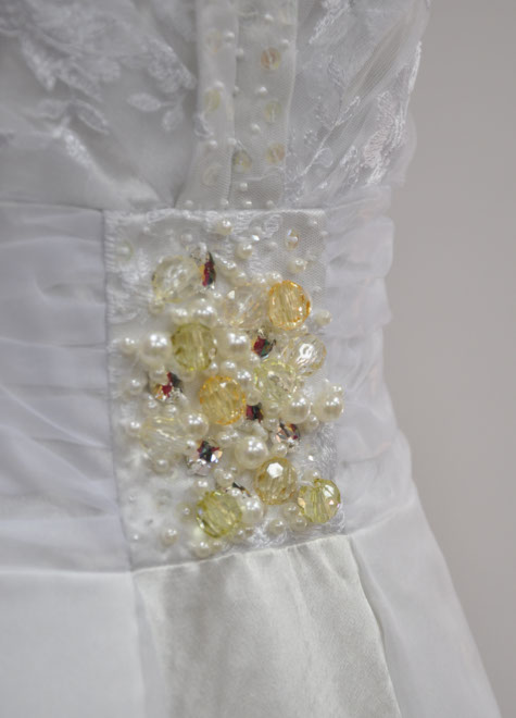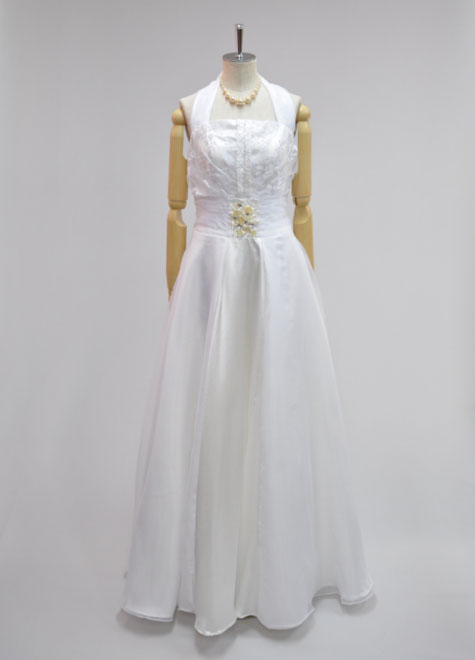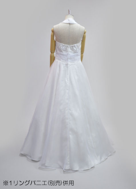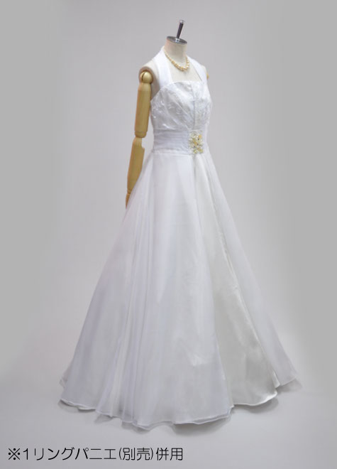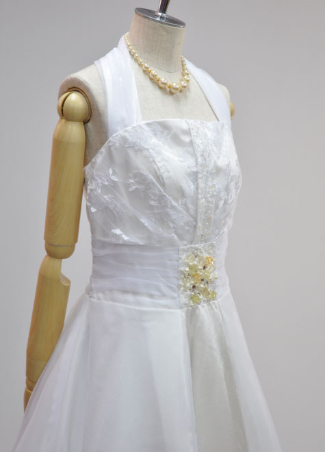 バストはふわっと♪ウエストはキュッと♪メリハリスタイルに見せてくれる素敵なデザインの一点物です。首の後ろをスナップで止めるホルターネックのラインからドレス本体の中心にデザインを集めた『縦ライン強調系』。柔らかい印象の白色ですが、背筋が伸びるような凛とした存在感でちょっと憧れてしまいそう…。1リングパニエの併用がお勧めですが、ドレス単体でも問題なくお使いいただけます。