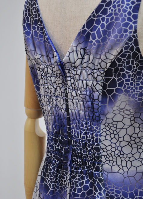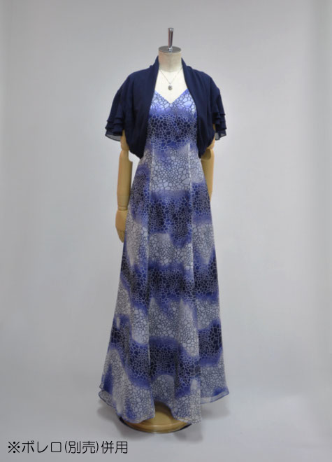 どことなくお着物のような「和」の雰囲気があるシフォンドレス。紺色のタフタストールをセットにしたシンプルな大人スタイルです。背面ギャザー仕様で着易いですよ♪