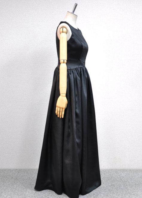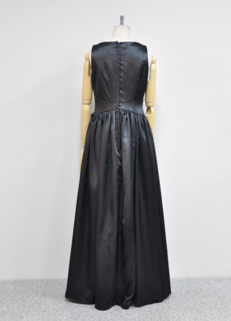 楽器演奏のお客様で襟周りの装飾がないものをお探しになる方も大変多いです。楽器が当たる…視界に入って気になる…等理由は様々ですが、シンプルな襟周りの黒ドレスがS丈にも登場です。ウエストの切り替えラインがちょっと個性的でおしゃれ。素材は滑らかなサテンです。