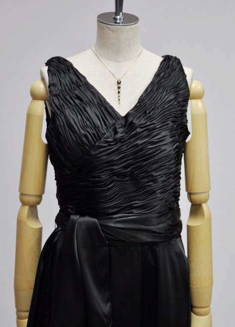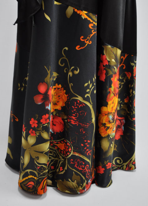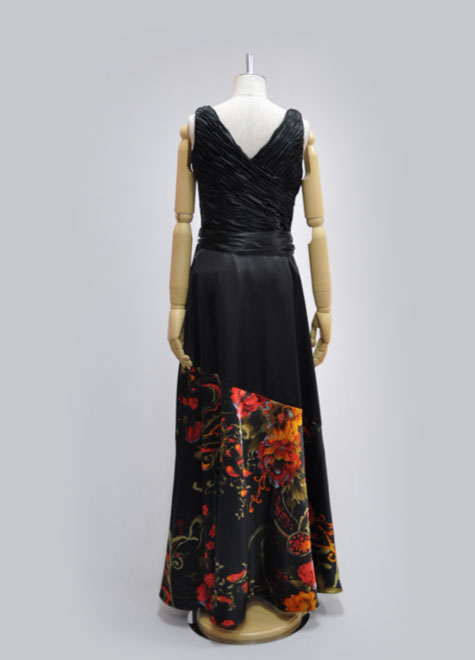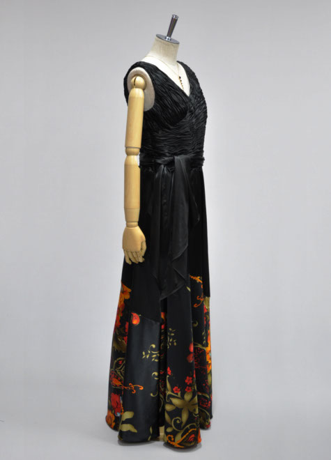 ブラックサテンの艶やかな印象を引き出す大胆なプリントが個性的。カッコいいイメージですので、シャンソンなどの大人っぽいステージにお使いいただけそう。上半身の細かいギャザーのデザインは一見膨張しそうに見えて、実はボディーラインをカバーしてくれる効果有り。通常背面ファスナーを使用しておりますが、こちらは背面のデザインを重視した左脇ファスナーとさせていただきました。左腰のリボンはループにリボンを通して結ぶスタイルですのでお好みで取り外すこともできます。
