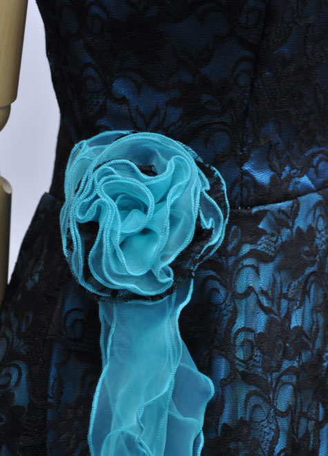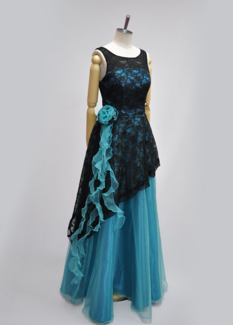 やや青味のあるグリーンオーガンジーにブラックレースを重ねた配色。半分以上を黒色が占めますが、素材がレースなのでグリーンが透けて暗くなりすぎないのがいいですね♪ノースリーブスタイルで胸元の露出も控えめな好印象ドレスです。コサージュは取り外しできます。