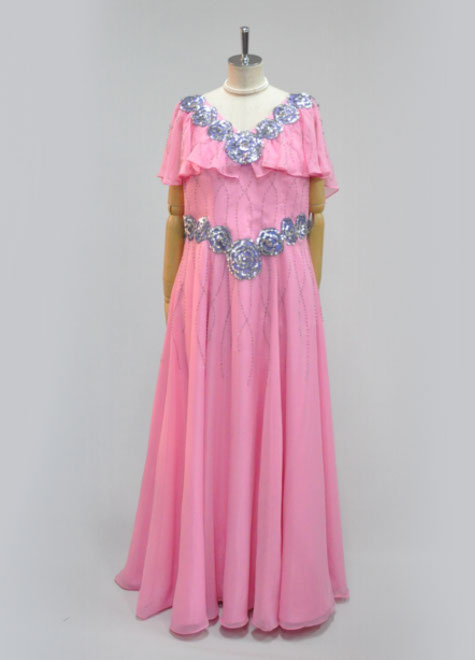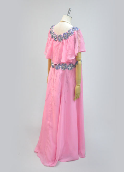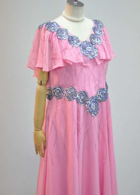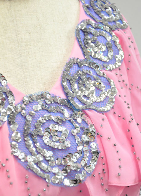 襟周りとウエスト周りのアップリケのようなフラワーモチーフはスパンコールが輝く舞台向けの装飾。