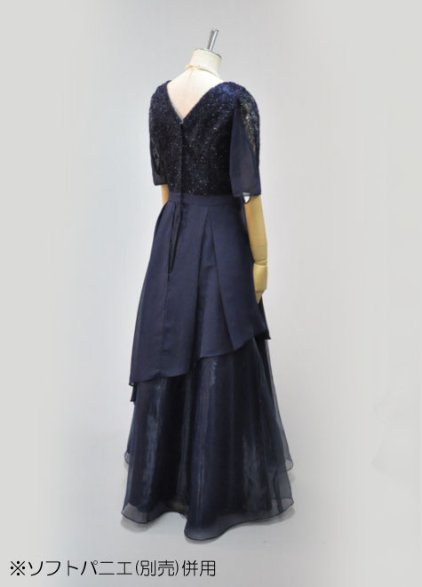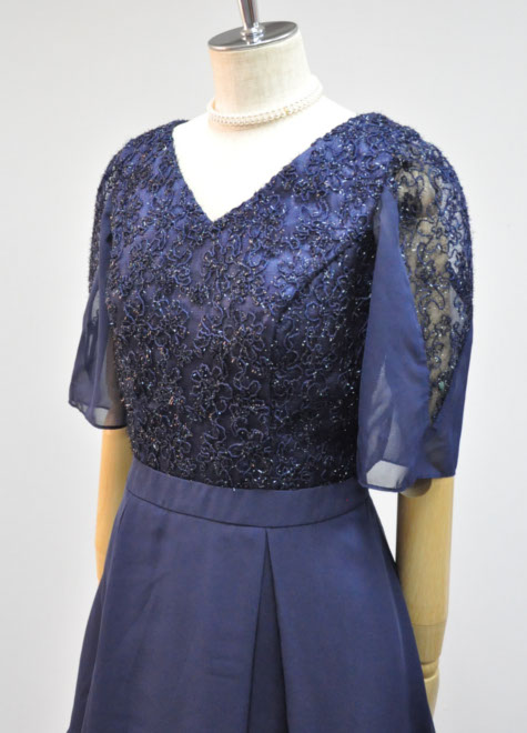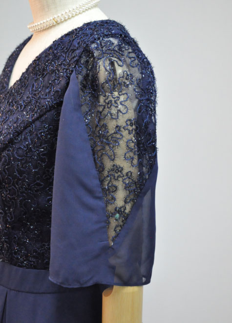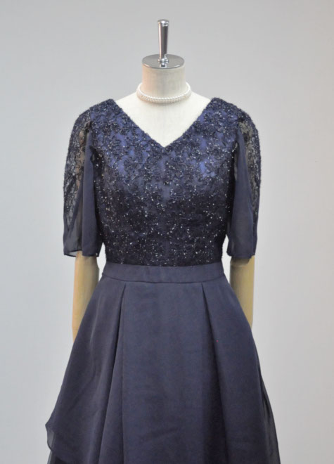 地模様のあるお袖と身頃はチュールレース、オーバースカートはシフォン、裾部分の光沢がある素材はオーガンジーと3種類の異素材を組み合わせた紺色ドレス♪伴奏などの控えめな出番にも個性が光ります。