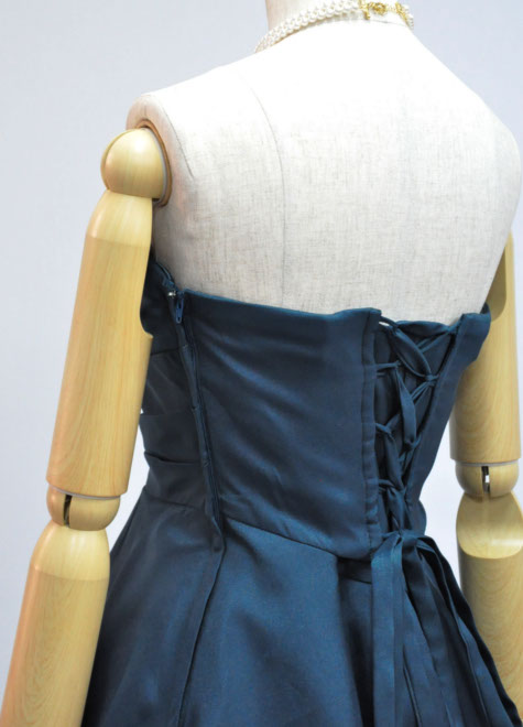 内側のインサイドベルトで上半身をしっかりホールドし、左脇ファスナーを上げ、背面をリボンで締め上げる着用方法です。