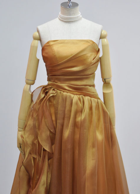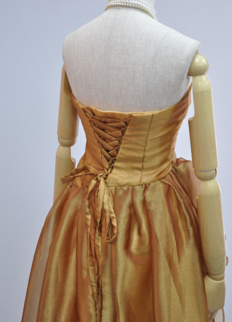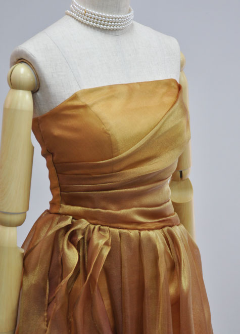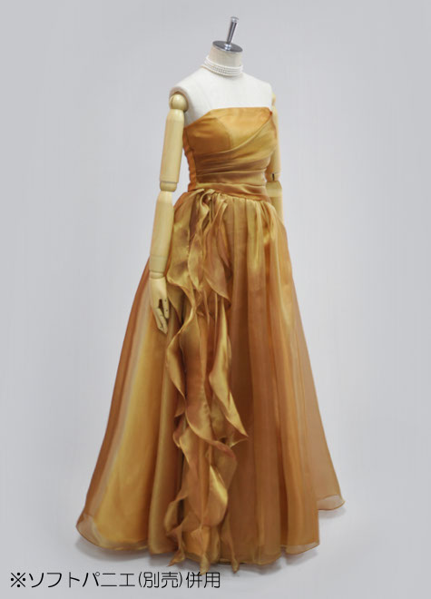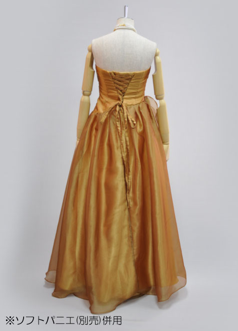 スパークオーガンジーを使用した高級感あるこちらのドレスはソロ演奏にもお勧め!ウエスト部分にギャザーをたっぷり寄せてありますので、ドレス単体で着用していただいても一番最後の画像のようなフンワリ感がございます。1リングパニエ併用で更にボリュームアップしても素敵。年齢問わず着ていただけるシルバーグレイとレッドの2色展開でしたが、今回は新色が2カラー登場。こちらはゴールドとブラウンを足したようなブロンズカラー。アンティークな雰囲気が素敵です。