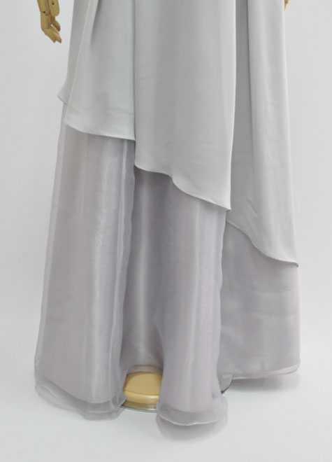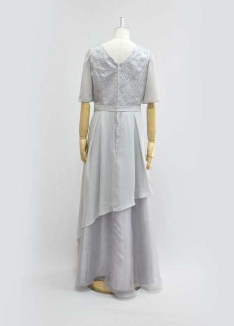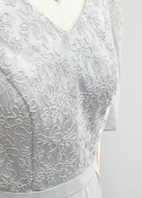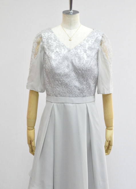 地模様のあるお袖と身頃はチュールレース、オーバースカートはシフォン、裾部分の光沢がある素材はオーガンジーと3種類の異素材を組み合わせました♪