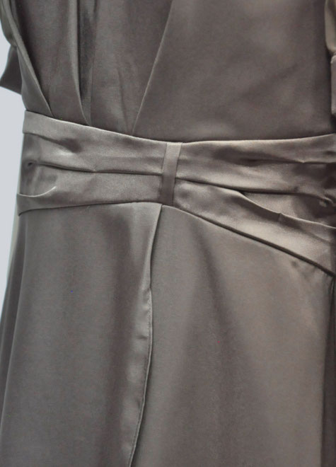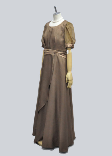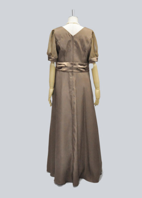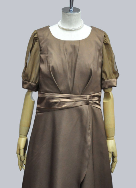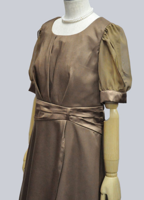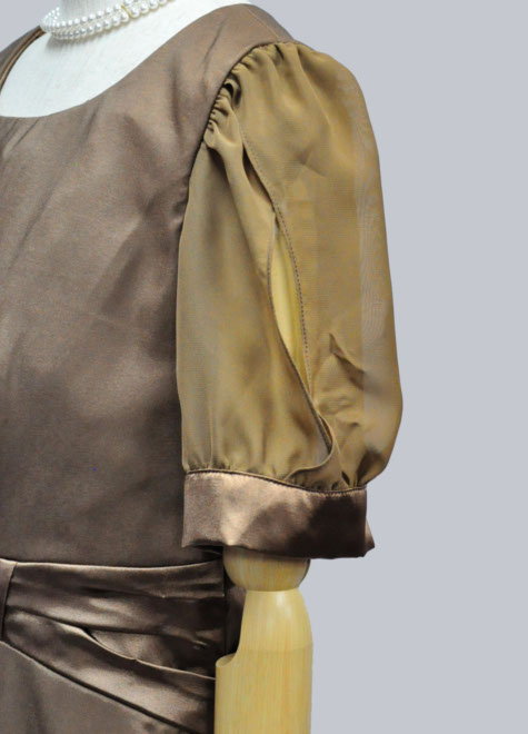 メイン素材はマットサテン。お袖のやわらかい素材はシフォンを使用。こちらのお色はモカ。ブラウン系のお色です。
