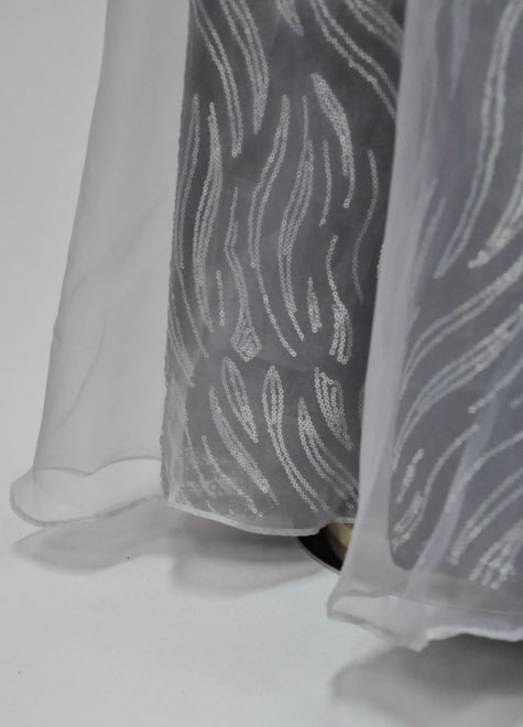 曲線的な柄のある素材は総スパンコールチュール。前面に使用するとかなり派手な素材ですが、オーガンジーを重ねて上品な華やかさに抑えています。