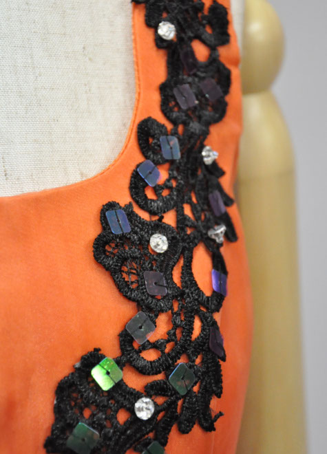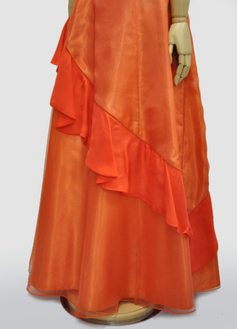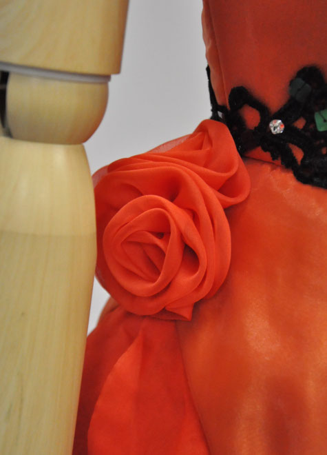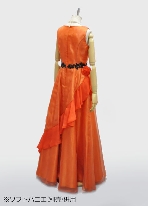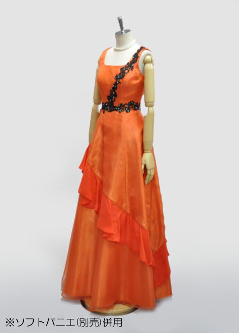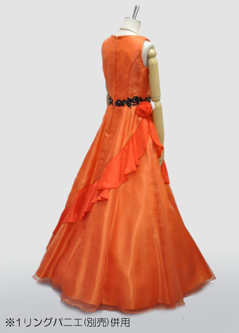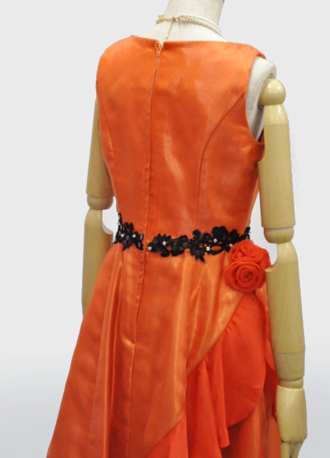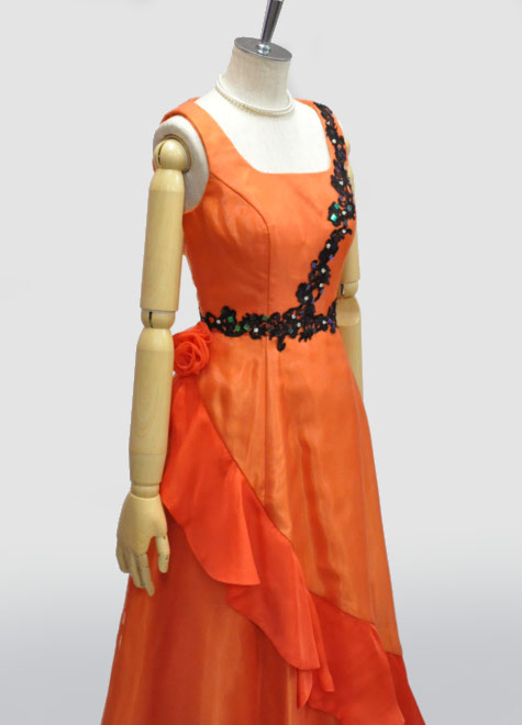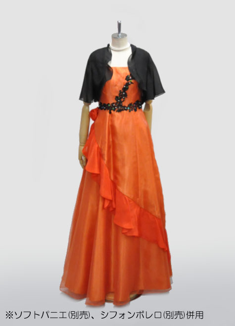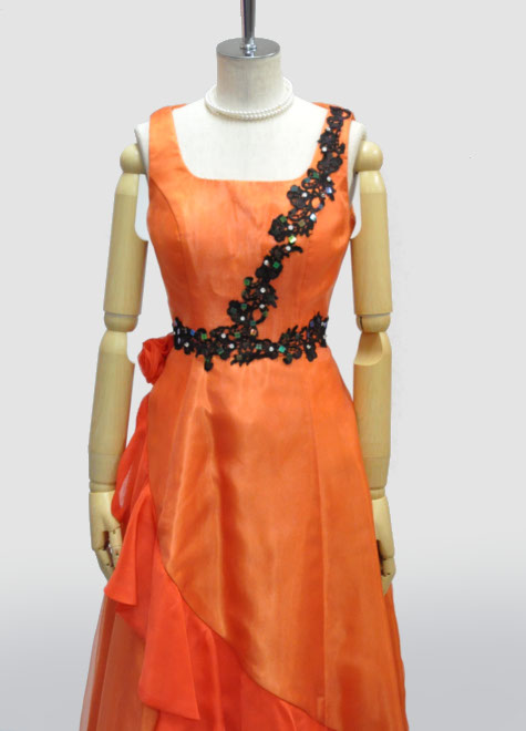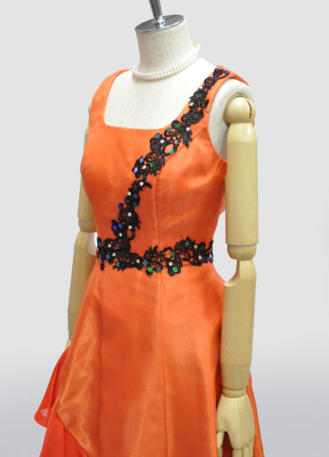 綺麗なオレンジオーガンジーに黒のレースがアクセントになったステージドレス。気兼ねなく着用できるノースリーブスタイルでして、小物使いでいろんなスタイルを楽しめる応用力も見逃せません!