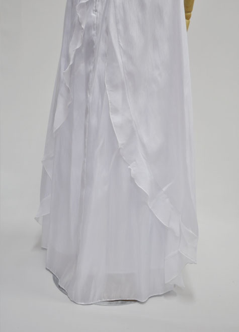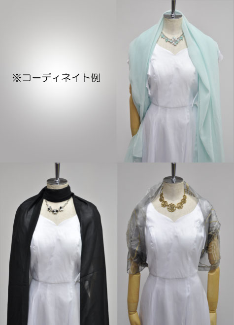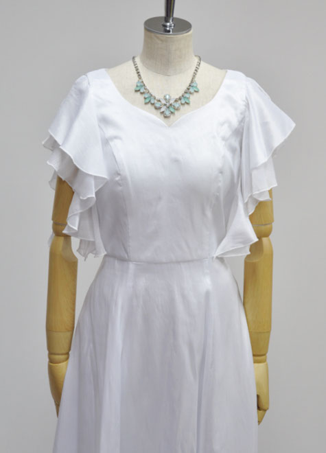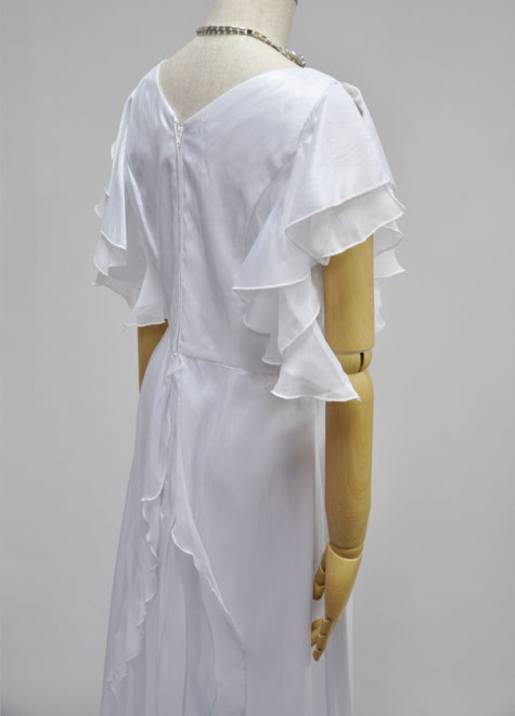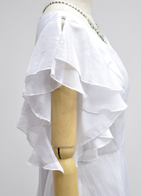 ウエディングドレスのイメージが強いため、舞台では白ドレスを避ける方が多い印象でしたが、最近は傾向が変わってきています。白は舞台に映えますし、肌のお色を問わずお顔を明るく見せてくれるお色ですので、思い切って挑戦する方が増加中。とは言え、デザインが華美なものは華やかになりすぎてしまいますので、こちらのようなシンプルで露出控えめなスタイルからお試しになるのがお勧めです。ドレス本体はタフタ、お袖の内側と、オーバースカートの縁のフリル部分はシワ加工シフォンを使用。フリルのようなお袖は肩先をチラッと見せるデザイン性のあるスタイル。裏地も付いておりますが、シンプルなデザインのためベージュ系の目立たないインナーがお勧めです。