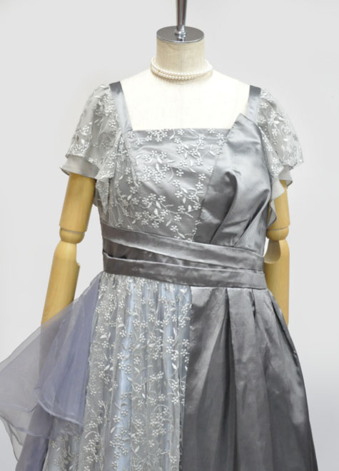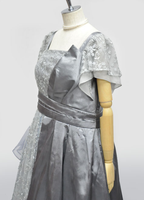 右と左で違うドレスみたい!角度によって表情を変えるアシンメトリーなデザインはいかがでしょうか?右側は小花レースとオーガンジーで可憐なイメージ。左側はタフタ素材がクールな印象。取り外し可能なコサージュを上手に使って、あなたらしく着こなしてくださいね♪
