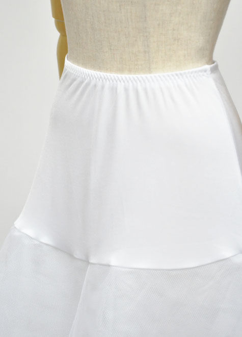 裾にリング(ワイヤー)が1段だけ入ったこちらのパニエは、ウエストからアルファベットの【A】のように広がり、立ち姿の美しいシルエットです。ウエスト周りがすっきりしておりますので、切替のないプリンセスラインのドレスとよく合います。ドレスの素材としては軽いオーガンジーと相性◎サテンやタフタなどの重みのあるドレスはドレス本体にチュール素材が縫い付けてあると◎