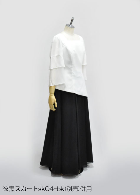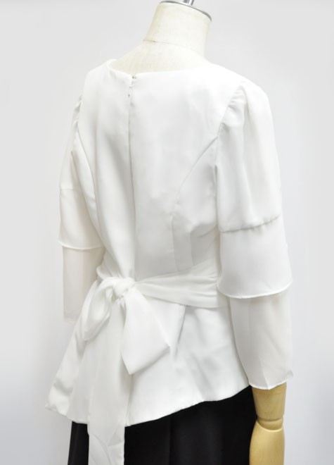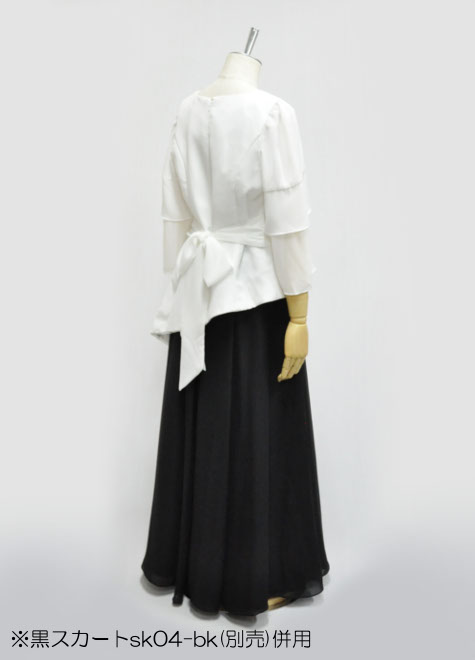 斜めにカットされた長めの裾が個性的なブラウス。伴奏や発表会用にいかがでしょうか?こちらのサイズは大柄の方でもゆったり着られるサイズ感ですので、迷ったときはワンサイズ小さめで大丈夫。お色はホワイトのみの商品です。