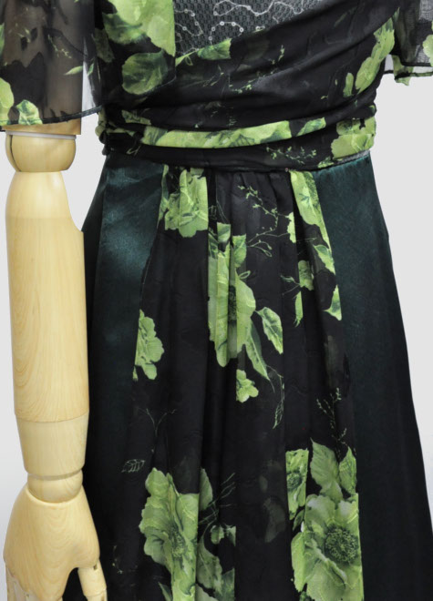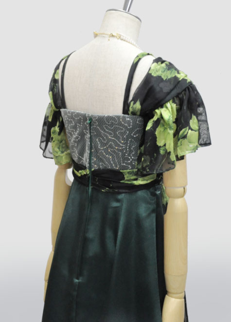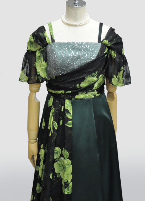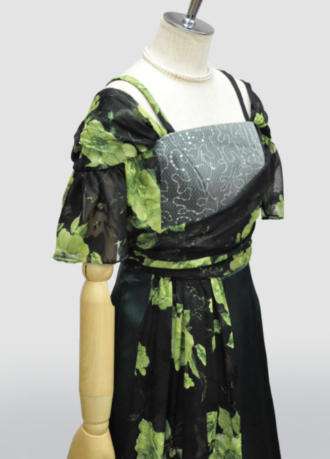 異素材の組み合わせが個性的で小柄な女性をスタイル良く見せてくれる不思議ドレス♪ローズ柄が一見甘い印象ですが、クールな女性に似合う大人スタイルです。