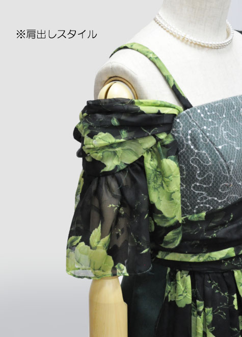上半身はストラップスタイルとお袖が融合したようなデザイン。お袖部分を下ろしてオフショルダースタイルも楽しめる2WAY構造ですが、オフショルダースタイルは腕の可動域が狭くなるのでご注意ください。