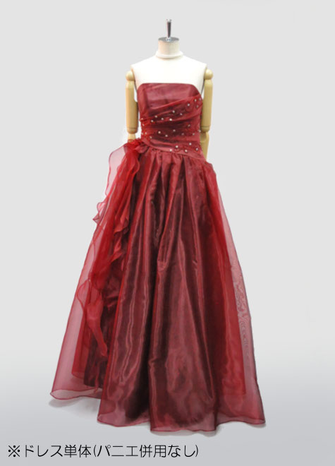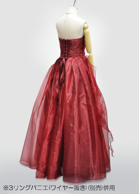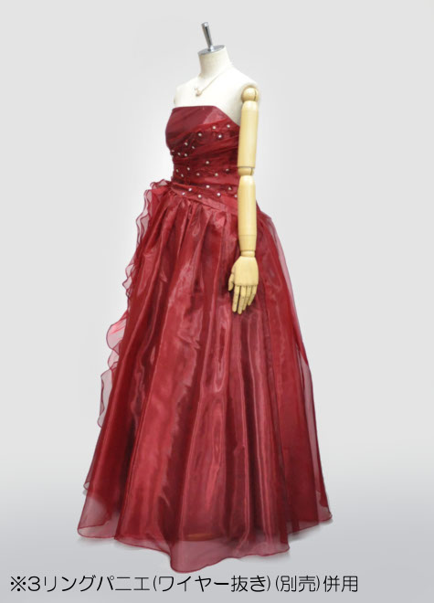 斜めのウエストラインと、右腰のフリルが特徴的なので、パニエの併用がお勧め。特にお写真の様にボリュームパニエ(3リングパニエのワイヤーを抜いています)をお使いいただくと、腰回りからふんわり丸みのあるシルエットになり素敵です。ドレス単体でもお使いいただけますが、身長+ヒール高=170cm以下の方には長めになります。丈ツメも考慮しつつご検討ください。