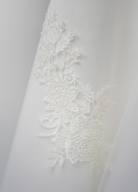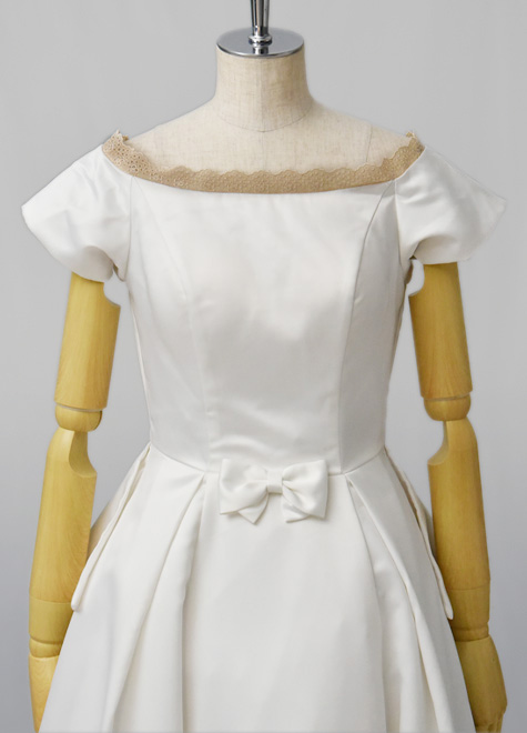 ボートネックにベージュのレースがナチュラルテイスト♪草原のチャペルが似合いそうな無垢な雰囲気です。
