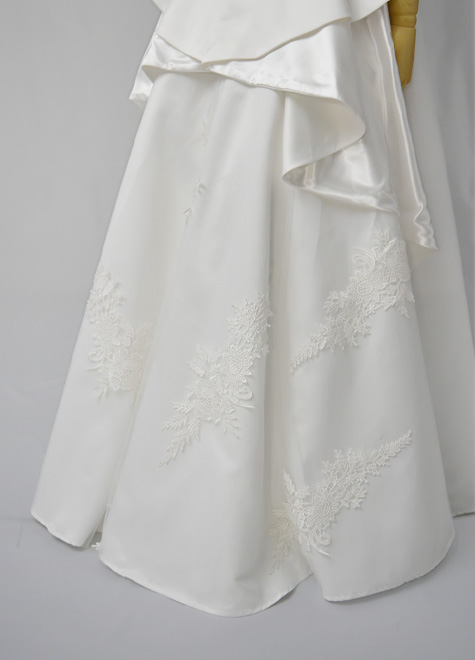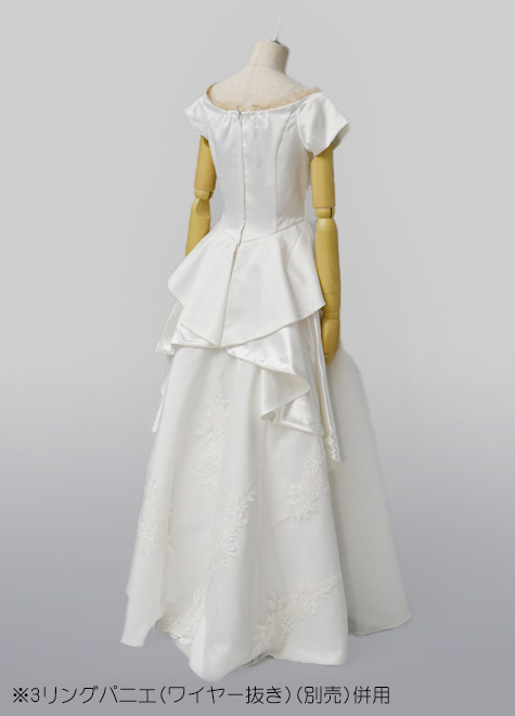 素材はマットサテンを使用。どっしりした生地のため、パニエ併用でもお写真のようなシルエットです。ドレス本体にもチュールが1層縫い込んであり、ドレス単体での使用も問題ございません。