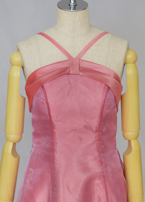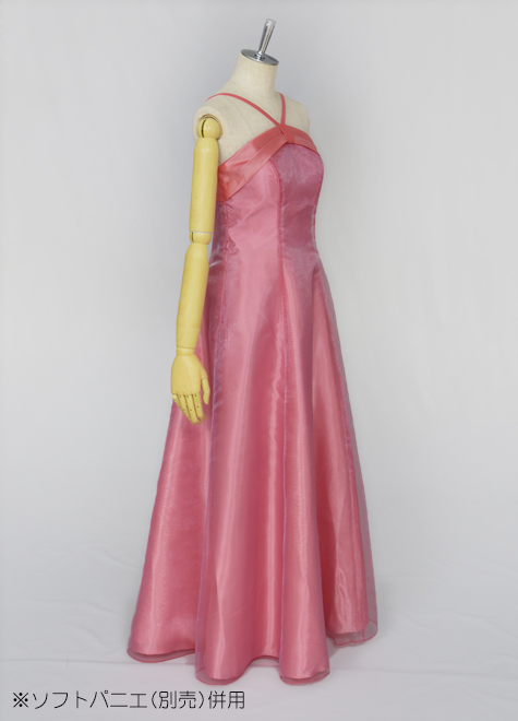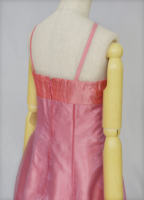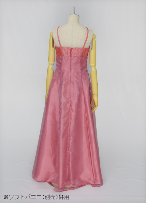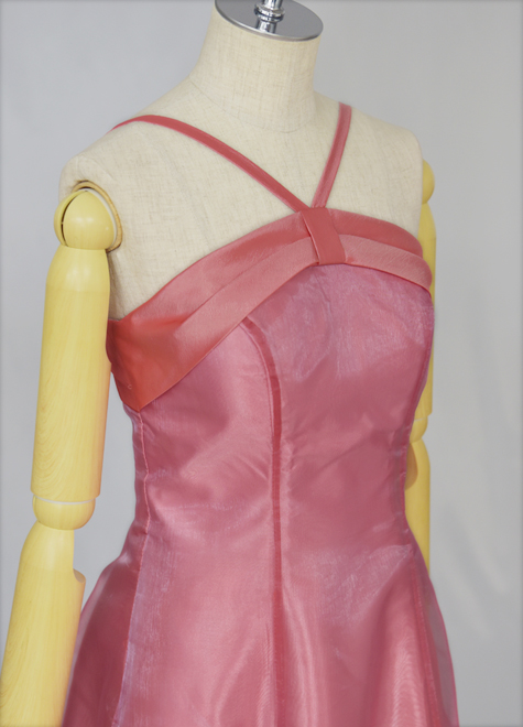 また、別生地の配置の効果で目線が高くなり、すら~っと見えるのも小柄な方にお勧めです。メイン素材はオーガンジー、胸元はタフタを使用。赤味の強いチェリーピンクです。