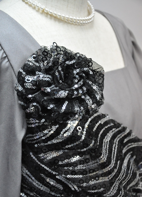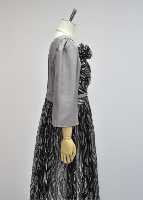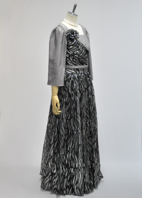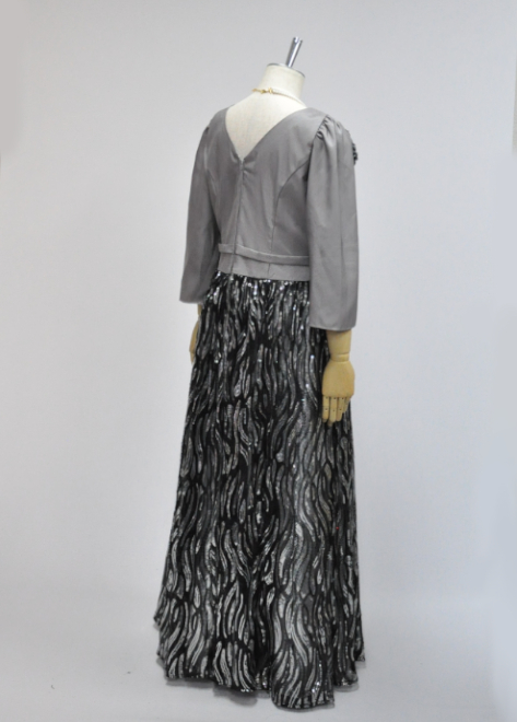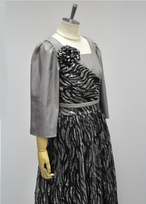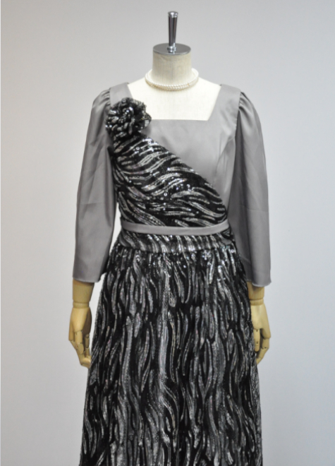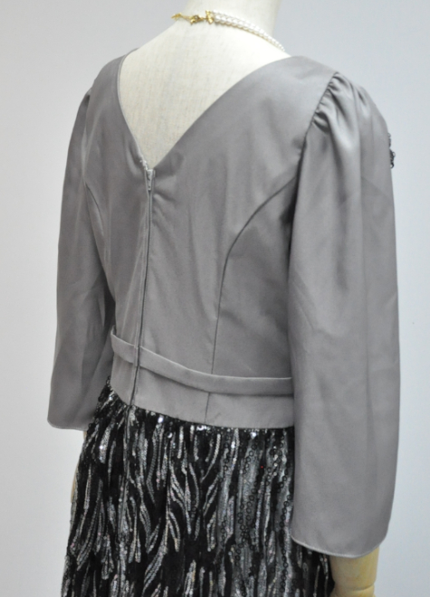 長めのお袖で腕がしっかり隠れるデザイン。控えめのグレー色と派手目のスパンコールを重ねることで絶妙な組み合わせを演出しました♪