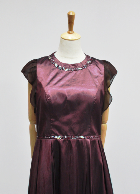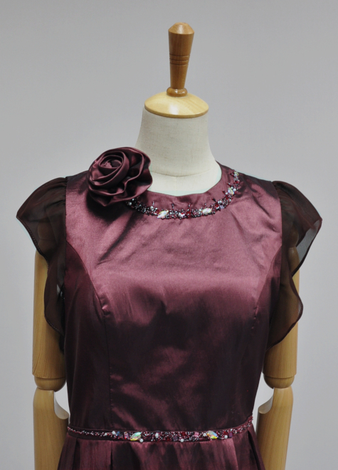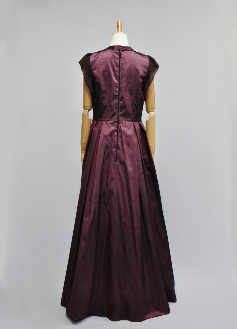緩やかなスタンドカラーが珍しいタフタドレス。シフォンのお袖がちょこっと付いて、気負うことなく着ていただけます!