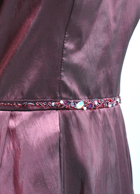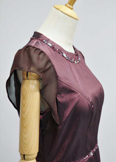 シャリ感のあるタフタ素材はサバサバ系女子に似合いそうなクールな印象。襟とウエストにはスパンコールとビーズの手刺繍をカラフルに施しました。