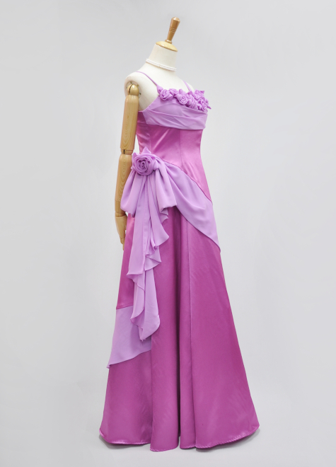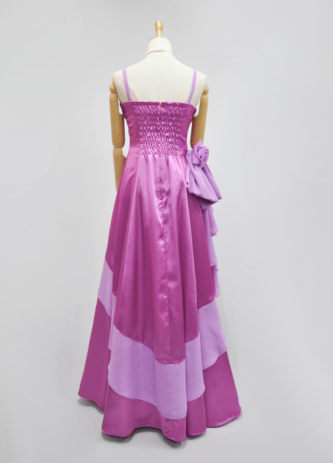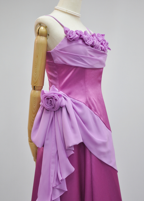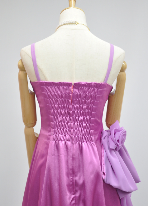 サテンはしっとり滑らかな素材ですので張りを持たせるデザインは少な目なのですが、今回はドレスの内側にチュール層を縫い足して、サテンでもふんわりしたシルエットでお使いいただけるよう工夫しています。メイン素材はサテン。