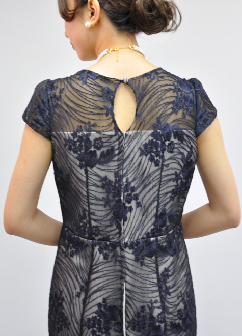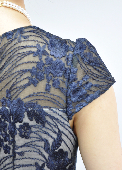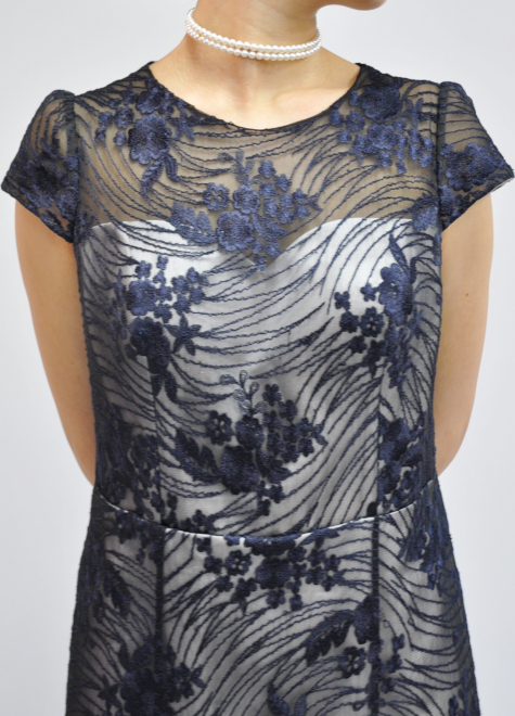 シックなネイビー色のレースに白サテンを重ねることで、レース生地の柄やデザインの動きをくっきりと際立たせました。