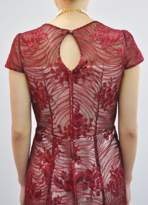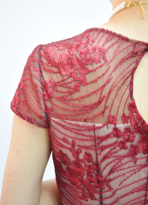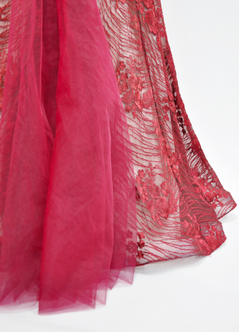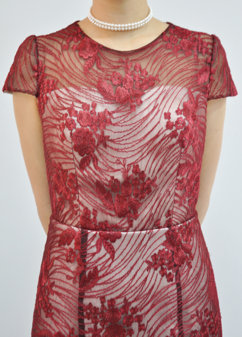 深いワインレッド色のレースに白サテンを重ねることで、レース生地の柄やデザインの動きをくっきりと際立たせました。