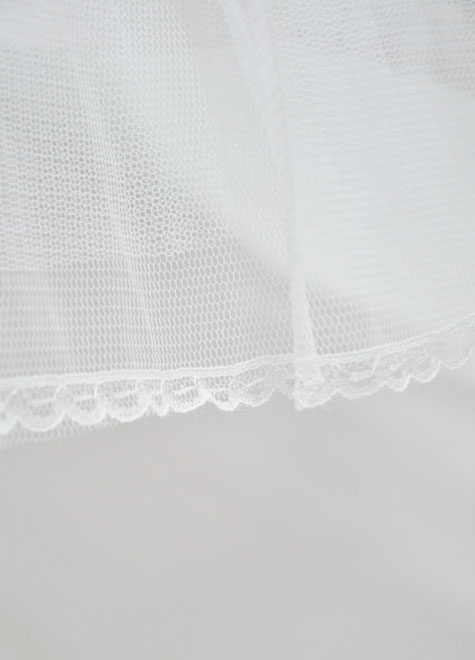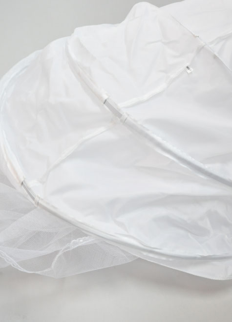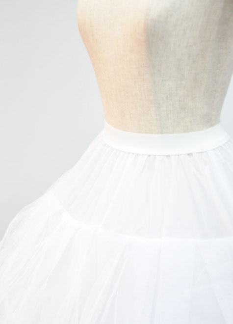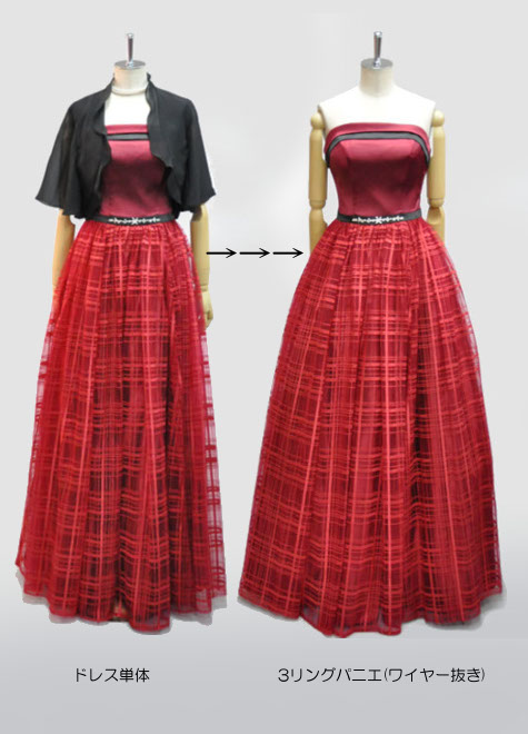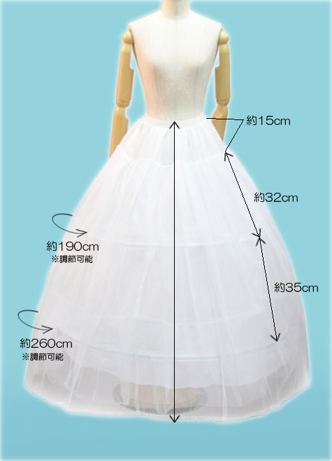 3段のワイヤーがドレスをベル型にボリュームアップしてくれる3リングパニエ。ウエストサイズはホックをかける位置によって5段階からお選びいただけます。