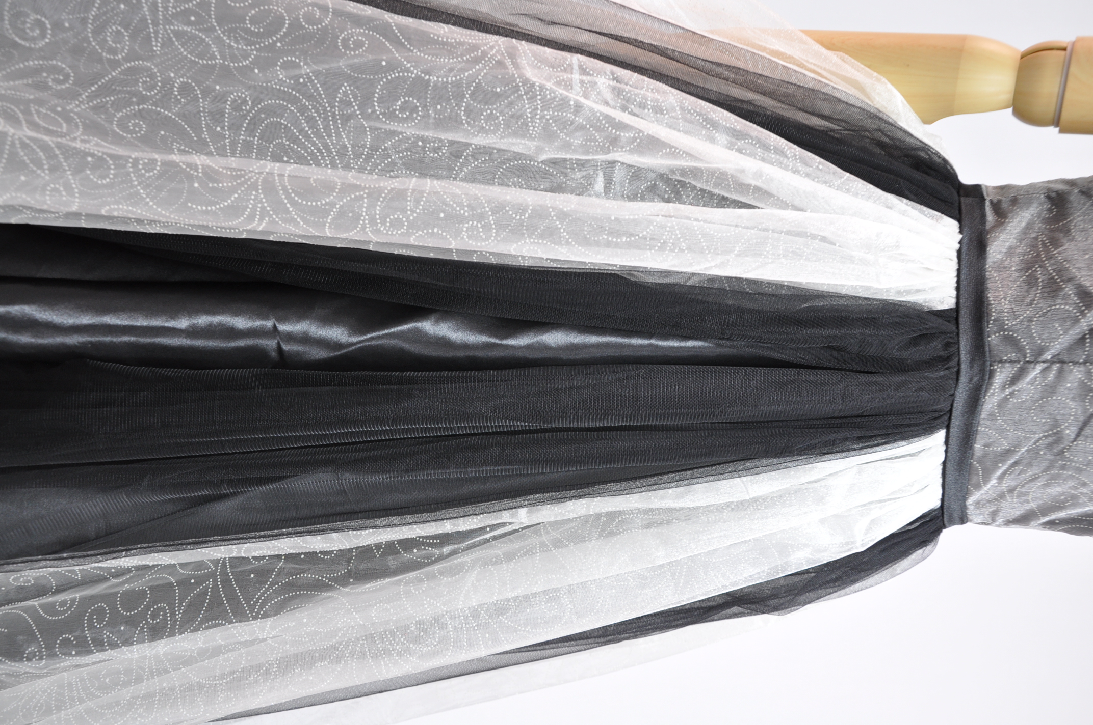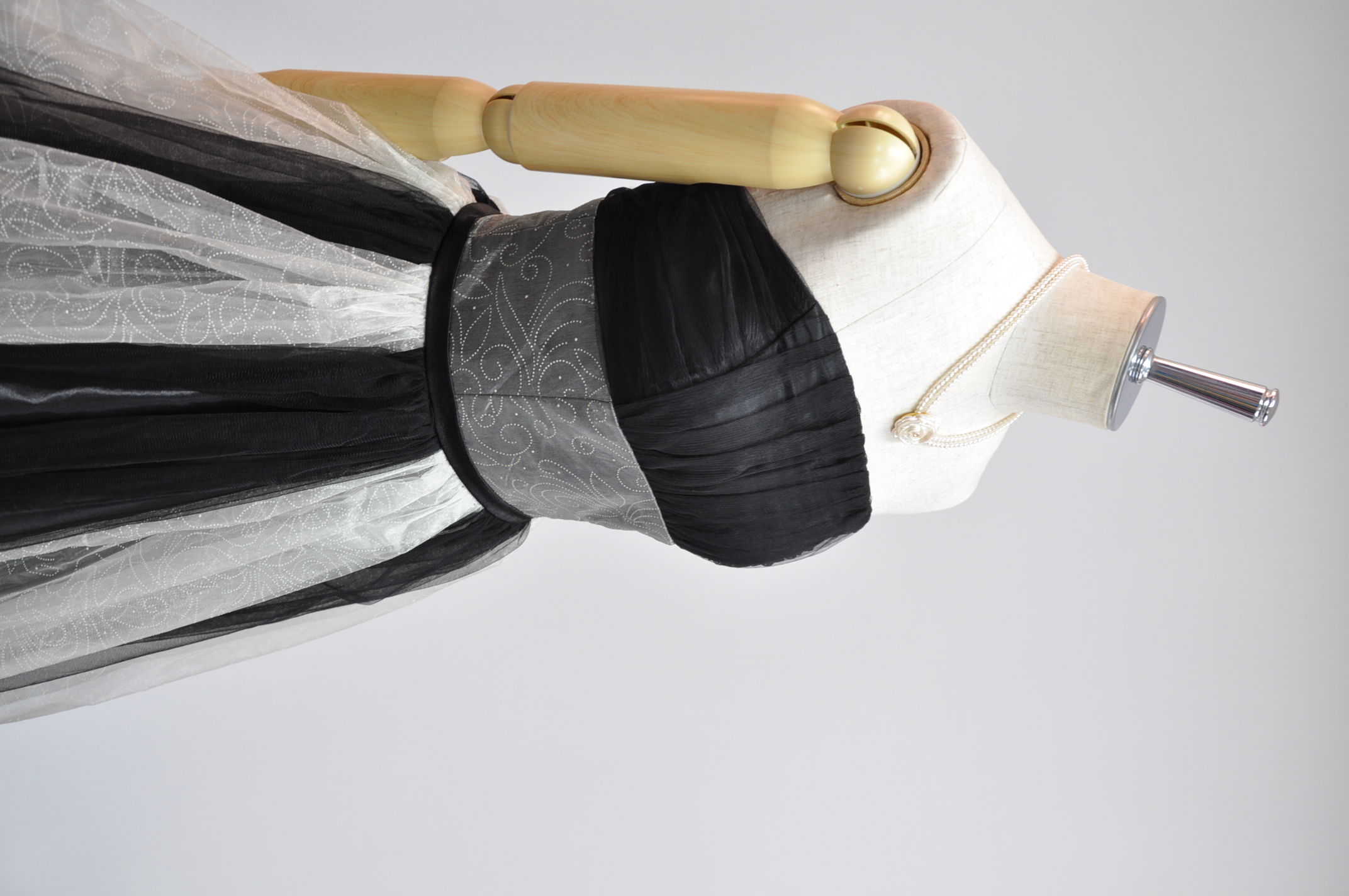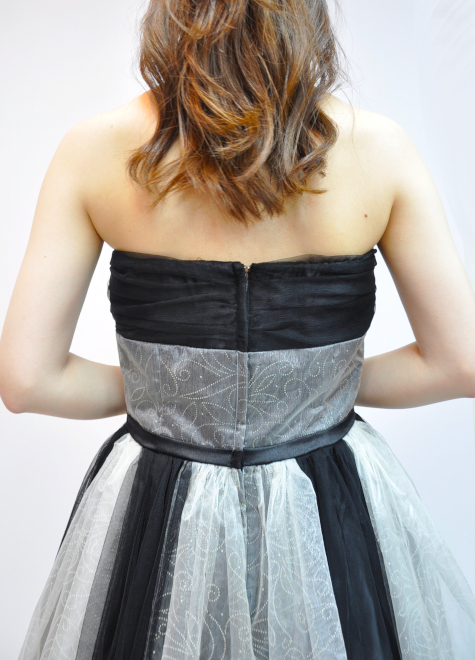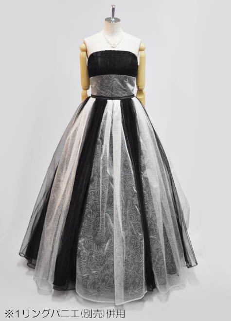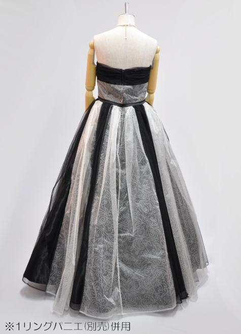 表地の白の部分はプリントオーガンジー、黒はソフトチュールで贅沢に3素材を組み合わせています。こちらはビスチェドレスですが背面編み上げのデザインではないので、舞台前にサラッと着られるのも嬉しいポイントです。