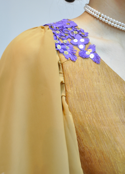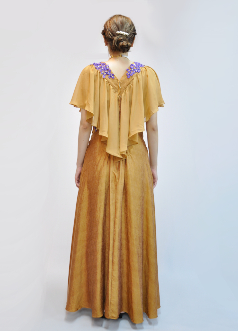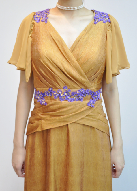 落ち着いた黄みの欄茶色というお色味。肩とウエストにはパープルのレースをアクセントとして組み合わせました。
