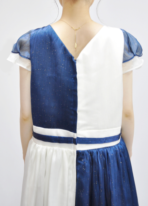 お袖の部分は異なるカラーの生地を組み合わせ、ドレス全体に統一感を。