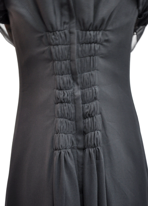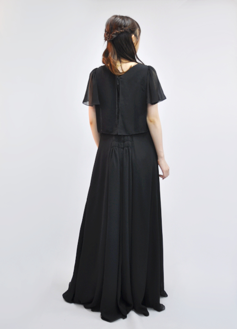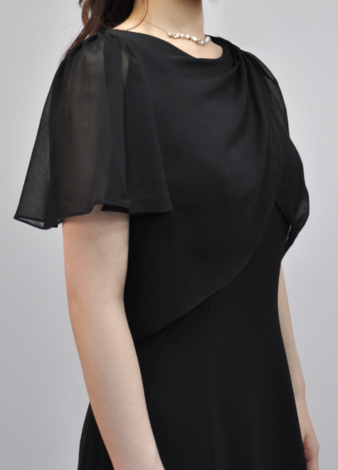 一見シンプルに見える黒ドレスですが、上半身のデザインがエレガントさを演出。左肩に生地を敢えてクシュっと集めて、シルエットに立体感をプラスしました。
