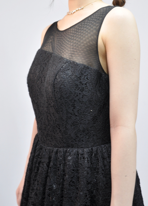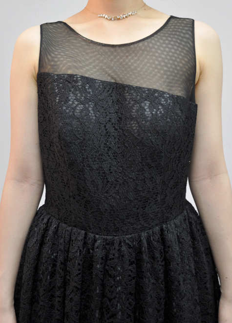 デコルテ部分のチュール生地と、胸元下からのレース生地の切り替え部分は、斜めに境界線を入れ少しだけ個性さをプラスしました。