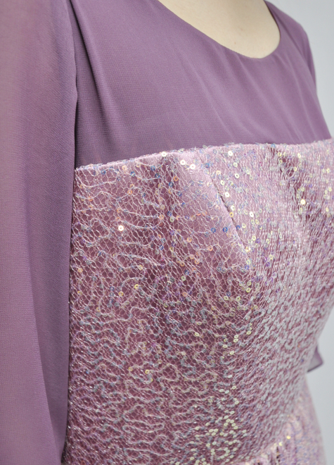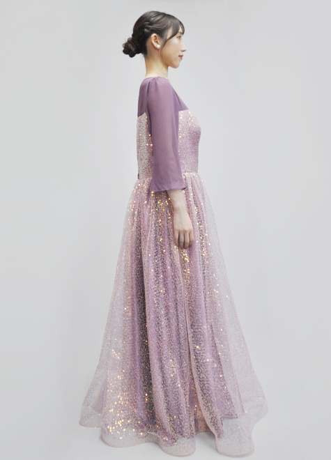 スパンコールチュールで重たくならないよう、デコルテと腕部分は透け感のある素材に。