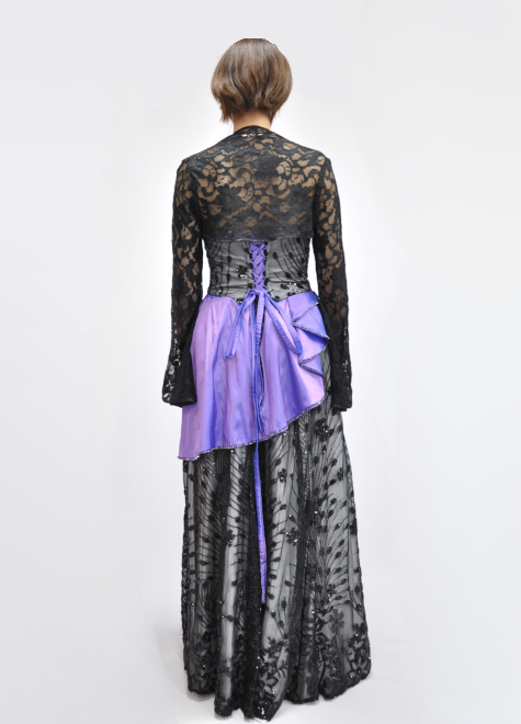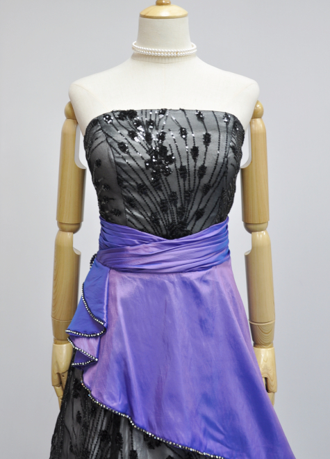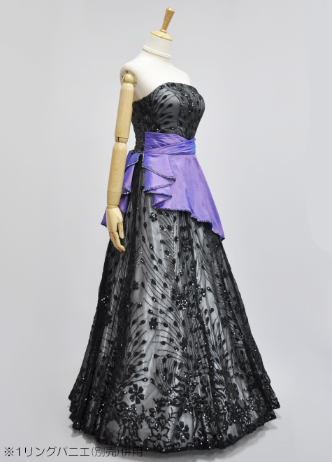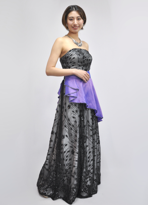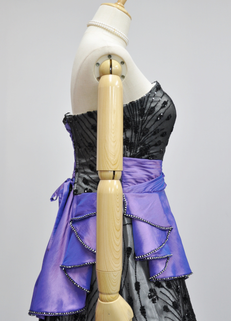 裏地のホワイトサテン生地×ブラックのスパンコールチュールドレスに、パープルがアクセントとなった1着です。